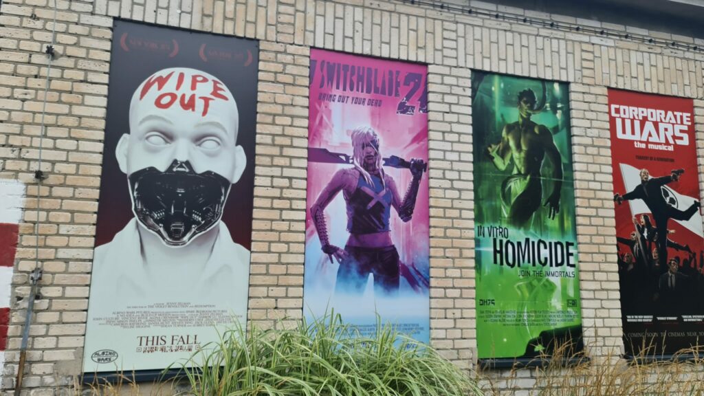 Wir mussten unsere Ausweise und QR-Codes aus den vorher erhaltenen Emails vorzeigen und wurden dann auch schon vor das Hauptgebäude gebracht. Zum Glück hatte es dann auch aufgehört zu regnen. Der ganze Ort erinnerte an ein stilisiertes Dogtown – es gab riesige Container mit Graffiti und BARGHEST-Logos, Fake-Militärequipment und große Militärzelte, wo wir uns mit Bier und Essen eindecken, aber auch mit anderen Leuten quatschen konnten. Jede Stunde kam einer der Mitarbeiter von CDPR und nahm eine weitere Gruppe (immer ungefähr 15 Leute) mit nach drinnen ins Gebäude, damit sie die Expansion anspielen durften. Uns anderen wurde aber auch nicht langweilig, als wir warten mussten – zwischendurch konnten wir an verschiedenen Wettkämpfen teilnehmen, um coole Preise zu gewinnen (zum Beispiel eine Edgerunners Ramen-Schüssel, das Cyberpunk 2077 Artbook und das Buch „Cyberpunk 2077: No Coincidence” von Rafał Kosik). Wir konnten Graffiti an einer großen Wand malen, Gruppenfotos mit Cosplayern machen oder Dart und Tischfußball spielen.